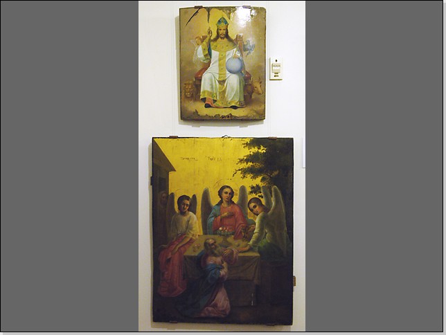 Salmin kirkon ikoneja Evakkokeskuksen näyttelyssä. Ylhäällä Kristus Kaikkivaltias, alhaalla Pyhä Kolminaisuus.