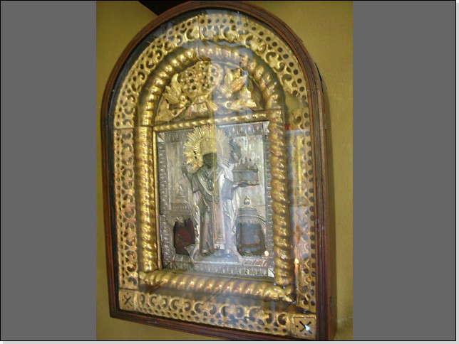 Mozaiskilainen Nikolaos (miekka oikeassa kädessä ja kaupunki vasemmassa) on Olli Ahtolan mukaan Suomessa perin harvinainen ikoni.